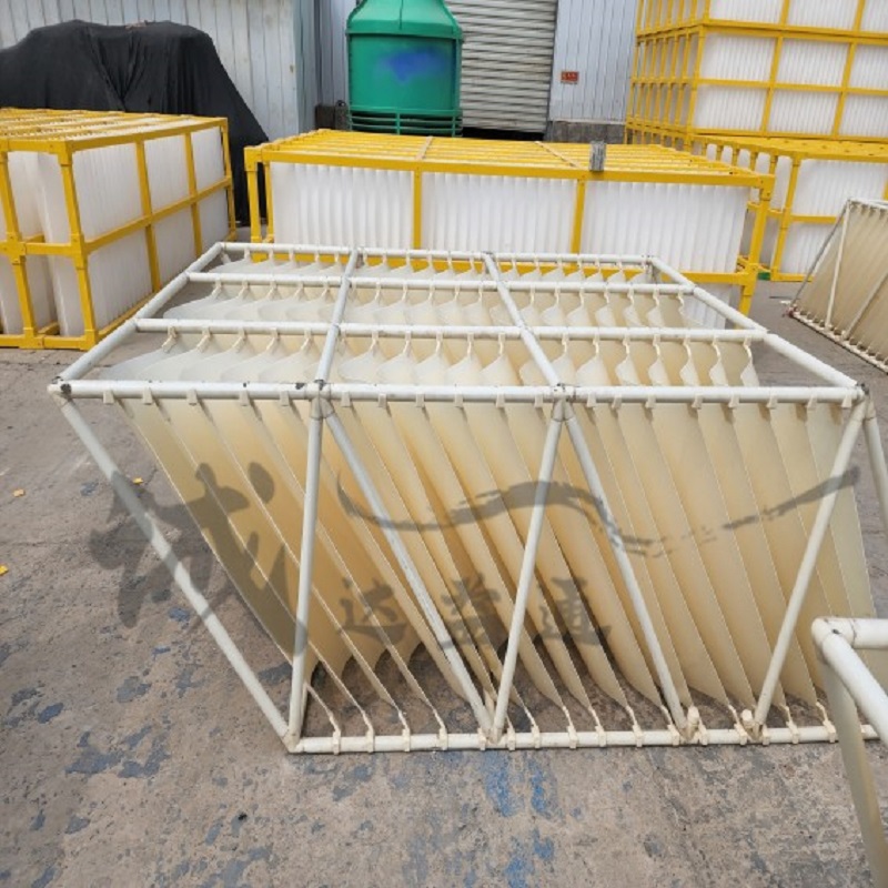 波形板波谷、波峰對(duì)稱地粘在定位卡上,構(gòu)成多將個(gè)縮頸和擴(kuò)大腔,組成單元箱體。縮徑處流速大,水流進(jìn)入擴(kuò)大腔后,形成渦流區(qū),每個(gè)擴(kuò)大腔便成為一個(gè)由渦流造成的”水力攪拌器“使水中礬花顆粒發(fā)生充分有效的碰撞、吸附、結(jié)大,便于沉淀。單元箱體為全塑制品,材質(zhì)采用ABS或PVC。