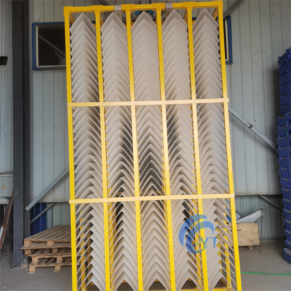 - 側(cè)向流A型斜板填料由一排排平行且傾斜角度在45-60°的平板組成,整體外形呈現(xiàn)為倒V型/A型。