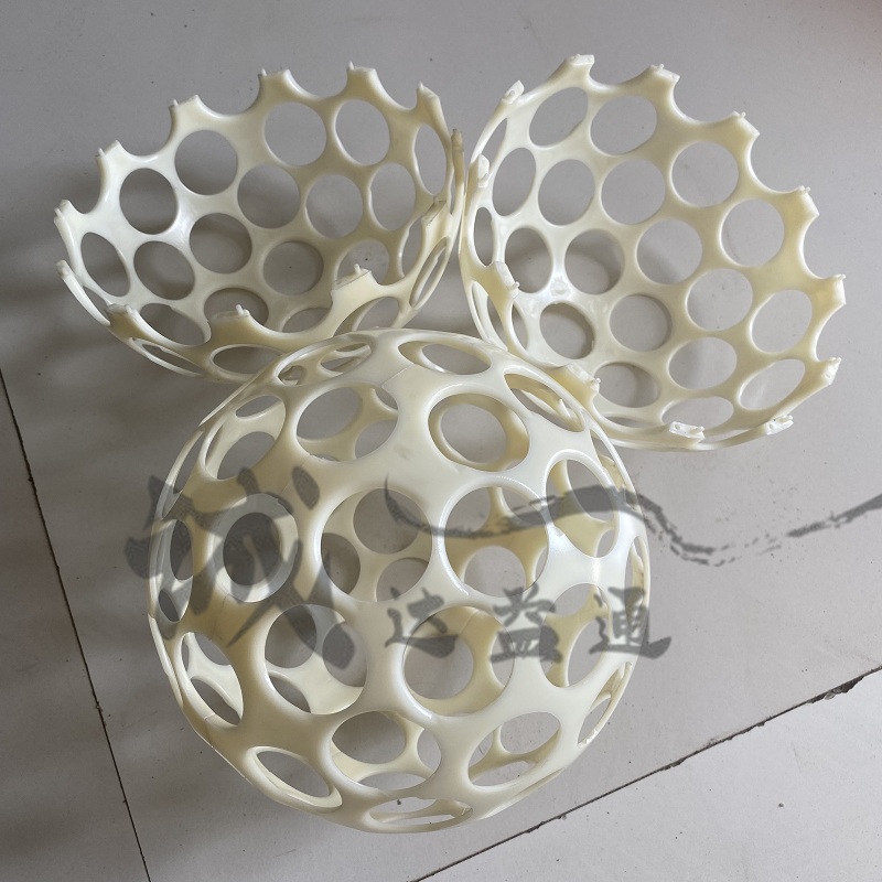 微渦流絮凝球通常由ABS塑料(丙烯腈-丁二烯-苯乙烯共聚物)制成,具有耐腐蝕、抗老化、抗沖擊性強(qiáng)等特點(diǎn)。其結(jié)構(gòu)為空心球體,直徑一般為200mm,表面開有大量孔洞(開孔率>60%,孔徑>30mm),內(nèi)部由經(jīng)向和緯向筋條支撐,形成貫穿的水流通道。